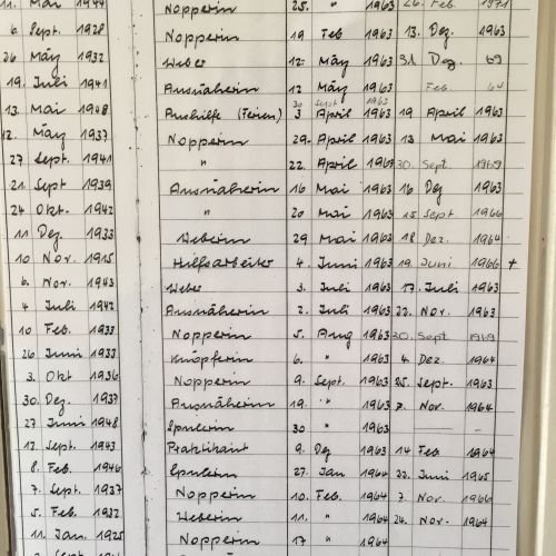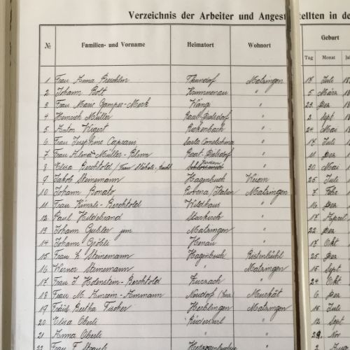 Es handelt sich um Verzeichnisse von Arbeiter und Angestellten sowie Heim- und Gastarbeiter der Weberei Matzingen aus den Jahren 1901 bis 1966. Sie zeigen auf, dass neben den Gastarbeitern aus Italien auch Arbeiter aus Istanbul angereist waren. Die Weberei Matzingen wurde 1861 als Spinnerei vom Textilunternehmer Max Lüthi gegründet. Ab dem Jahr 1897 bis zur Einstellung der Produktion 1970 gehörte die Weberei Matzingen der aus Zürich stammenden Familie Gyr. Ab den 50er-Jahren begann die Weberei sich u.a. auf elastische Wollstoffe für Skianzüge oder feine Wollschleier für Nonnen zu spezialisieren, um konkurrenzfähig zu bleiben. Doch schliesslich musste die Weberei Matzingen hauptsächlich aufgrund von Konkurrenzdruck die Produktion 1970 einstellen.