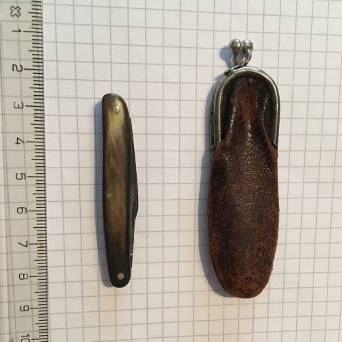 Dieses kleine Taschenmesser stammt aus einer ehemaligen, kleinen privaten Schneiderei im Thurgau. Es wurde vor etwa 150 Jahren verwendet, um Nähte aufzutrennen oder Fäden zuzuschneiden. Das Messer hat einen Horngriff und die Klingen sind aus mittlerweile korrodiertem Stahl. Das Objekt verfügt über zwei Klingen unterschiedlicher Grösse, bei welchen durch unachtsamen Gebrauch einst Stücke aus der Klinge gebrochen wurden. Dazu kommt eine kleine, noch funktionierende Schere. Erhalten geblieben ist überdies eine zum Messer passende Lederhülle. Das Objekt ist ein Familienerbstück und ist nicht mehr im Einsatz.