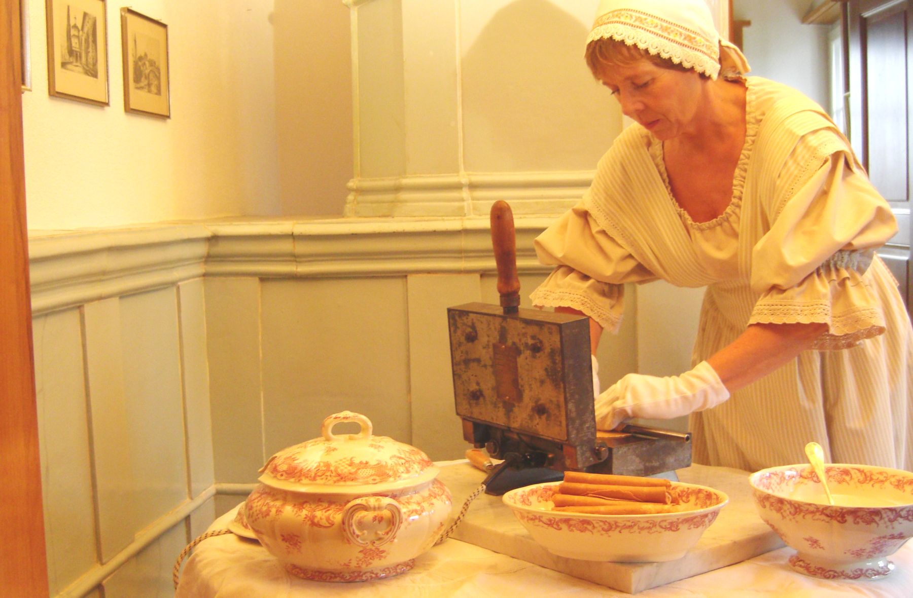 Es wurde jeweils im Akkord gearbeitet. Für jede Frau gab es zwei Waffeleisen. Während eines geschlossen war, wurde das andere geöffnet, die Hüppe gerollt, erneut Teig aufgetragen und geschlossen. So wechselten sich diese zwei Waffeleisen ab. Das hier abgebildete Waffeleisen war der Grundstein für die Gottlieber Hüppen und das wichtigste Arbeitsutensil überhaupt. Auch die heutigen Backmaschinen basieren noch auf diesem System.