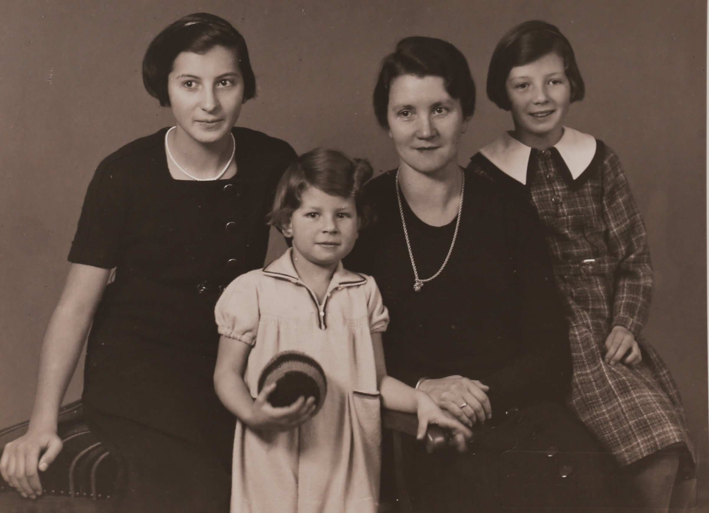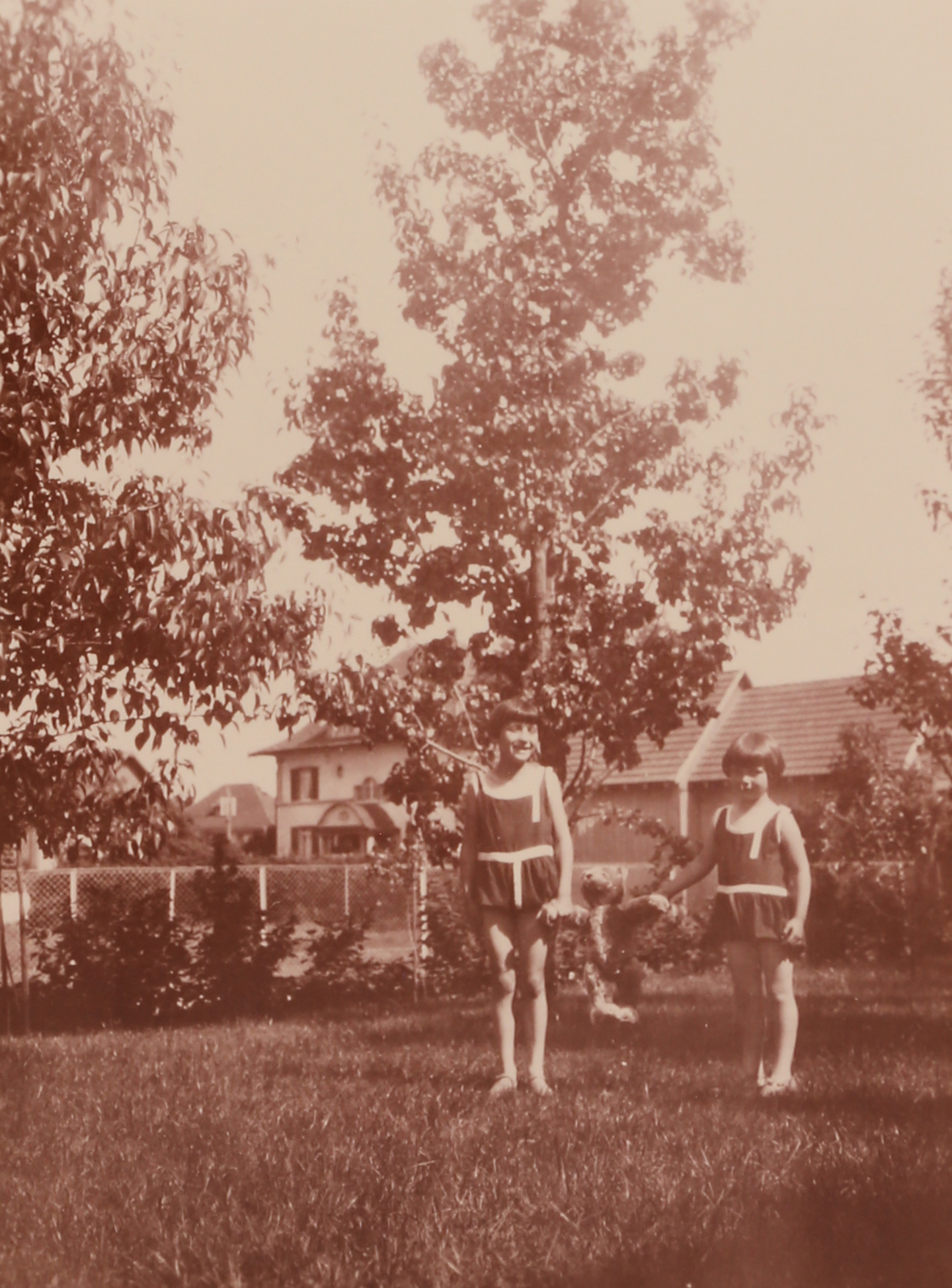 Greti Büchi, Directrice in der elterlichen Trikotfabrik Gustav Müller-Renner AG in Kreuzlingen von 1944-1955, erzählt, weshalb sie als Mädchen in Eigenkreationen turnte und warum ihr Vater seinen Töchtern die langen Zöpfe abschneiden liess. Im ersten Bild Greti Büchi (rechts) im neusten sportlichen Modehit aus der elterlichen Produktion. Zweites Bild: Greti Büchi (ganz rechts) mit ihrer Mutter und ihren Schwestern, alle mit modernem Pagenschnitt.