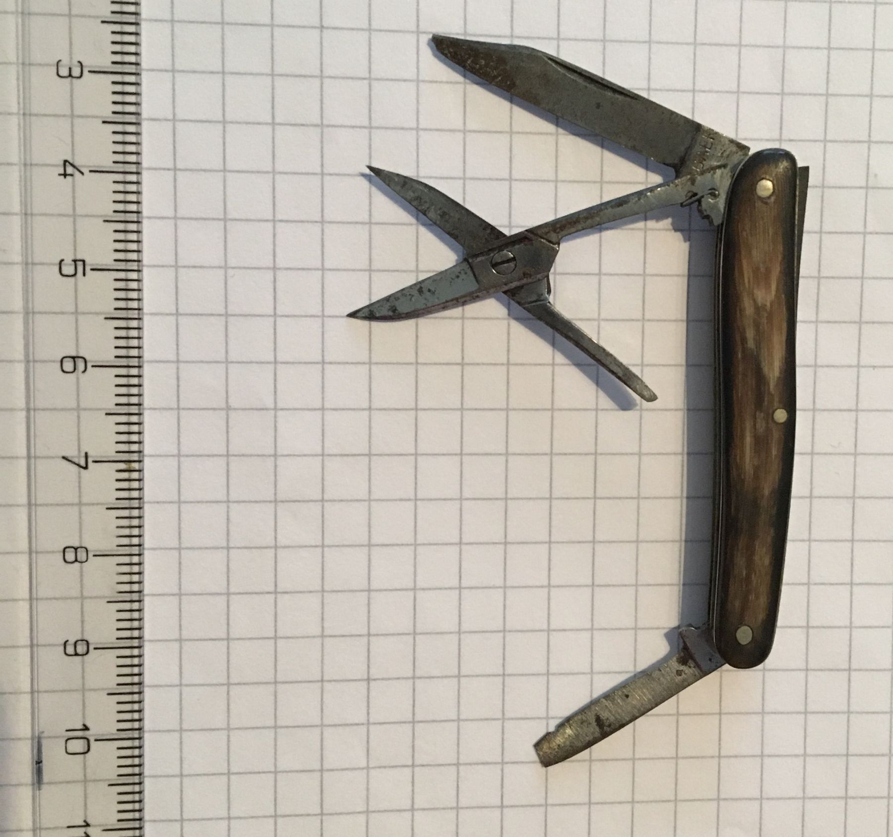 Dieses kleine Taschenmesser stammt aus einer ehemaligen, kleinen privaten Schneiderei im Thurgau. Es wurde vor etwa 150 Jahren verwendet, um Nähte aufzutrennen oder Fäden zuzuschneiden. Das Messer hat einen Horngriff und die Klingen sind aus mittlerweile korrodiertem Stahl. Das Objekt verfügt über zwei Klingen unterschiedlicher Grösse, bei welchen durch unachtsamen Gebrauch einst Stücke aus der Klinge gebrochen wurden. Dazu kommt eine kleine, noch funktionierende Schere. Erhalten geblieben ist überdies eine zum Messer passende Lederhülle. Das Objekt ist ein Familienerbstück und ist nicht mehr im Einsatz.
